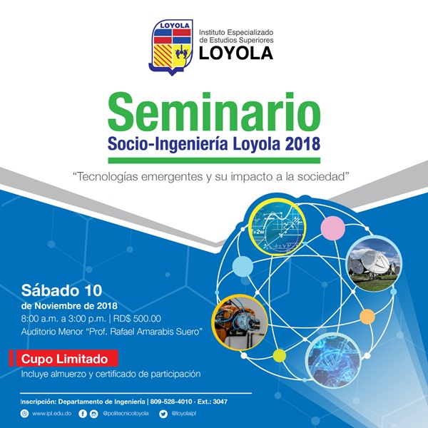 El Instituto Especializado de Estudios Superiores Loyola (IEESL) celebrará el Seminario Socio-Ingeniería Loyola 2018, este año con el tema "Tecnologías emergentes y su impacto en la sociedad".